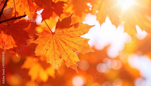 Vibrant autumn leaves glowing in sunlight, creating a warm atmosphere in a serene setting
