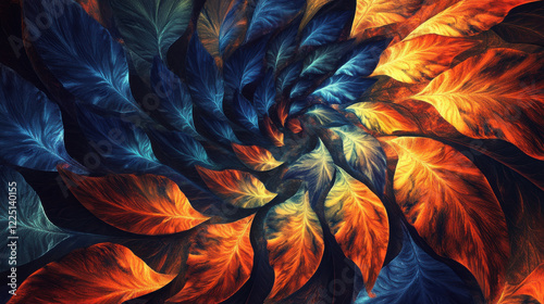 Vibrant autumn leaves swirl in mesmerizing spiral pattern, evoking warmth and beauty