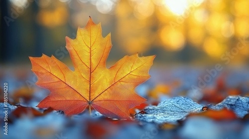 Vibrant Autumn Maple Leaf with Frost on the Ground