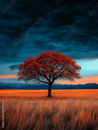 Vibrant Autumn Tree Against Dramatic Sky at Dusk in Open Field