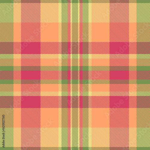Vibrant autumnal plaid pattern in warm orange, pink, and green hues. Perfect for textile design, fashion, home decor, and website backgrounds. Evokes feelings of warmth, comfort, and rustic charm.
