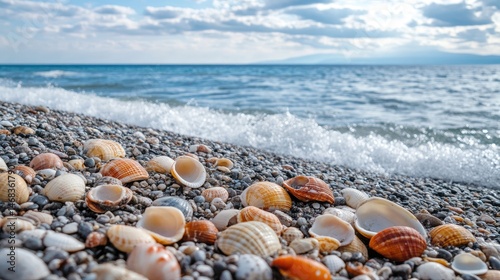 Vibrant beach backdrop with bright blue sea, foamy waves rolling in, and shells scattered along the shoreline