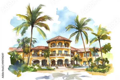 vibrant beachfront luxury hotel surrounded by tropical palm trees