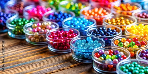 Vibrant beads, nestled in clear plastic, create stunning macro photography against a warm wooden backdrop.