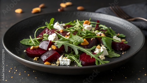 Vibrant beet salad with goat cheese and arugula on a dark plate