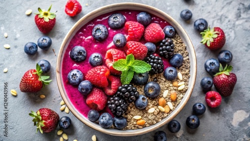 Vibrant Berry Smoothie Bowl with Fresh Raspberries, Strawberries, and Blueberries Topped with Seeds and Mint Garnish