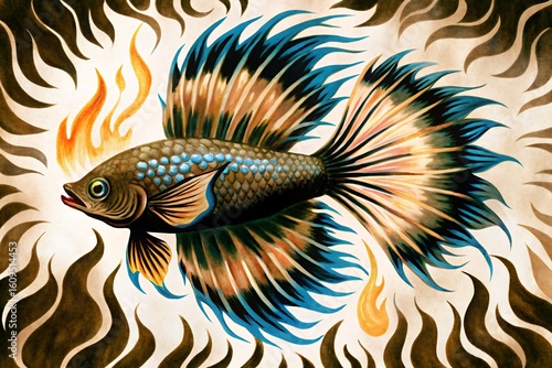 Vibrant betta fish with fiery fins and intricate scales amidst abstract flames