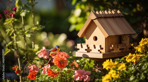 Vibrant Bird on Birdhouse Amidst Colorful Flowers in a Garden