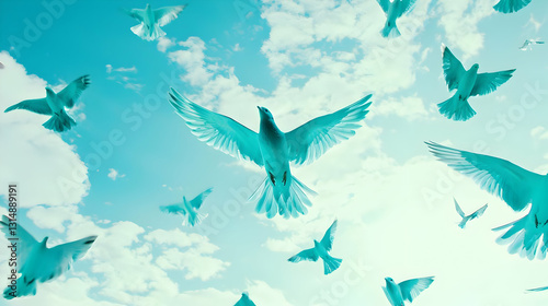 Vibrant Birds Soaring in a Bright Sky with Fluffy Clouds Above