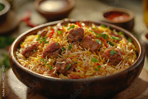 Vibrant Biryani with Yellow Rice and Meat Pieces in Wooden Bowl on Earth-Toned Background