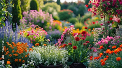 Vibrant blooming flowers in a lush garden setting showcasing colorful blossoms and greenery for a picturesque outdoor landscape.