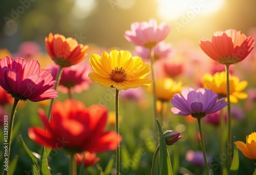 vibrant blooms illuminated soft natural light capturing beauty colorful flowers, petal, blossom, flora, garden, botanical, sunlight, leaf, grass, plant