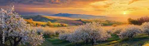 Vibrant blossoms blanket the rolling hills as the sun sets, casting warm hues over the lush orchards. The landscape invites serenity and appreciation for nature's beauty during golden hour