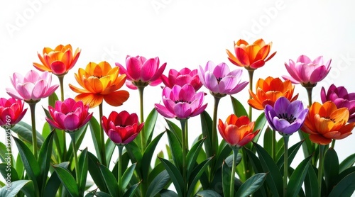 Vibrant blossoms of various colors arranged in a delightful row against a stark white backdrop, showcasing the beauty and diversity of springtime flowers.