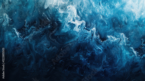 Vibrant blue abstract ocean waves with swirling patterns and textures create mesmerizing visual effect. deep hues evoke sense of calm and tranquility
