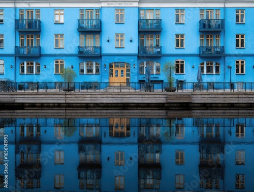 Vibrant blue apartment building reflected in canal