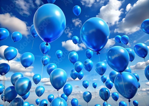 Vibrant blue balloons in various shapes and sizes float away against a bright blue sky with fluffy white