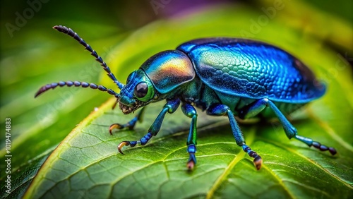 Vibrant Blue Beetle Crawling on Green Leaf in Nature's Habitat Captured in Detailed Close-Up Shot