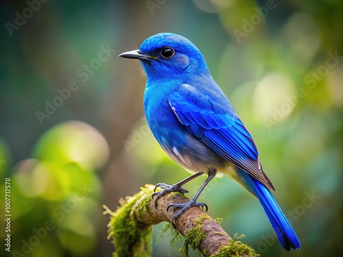 Vibrant Blue Bird Perched on Branch Against a Soft Focus Background of Nature and Greenery