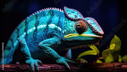 Vibrant Blue Chameleon on Branch with Exotic Wildlife Portrait.