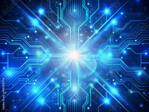 Vibrant blue futuristic background featuring intricate geometric patterns, glowing circuit lines, and radiant light waves, representing cutting-edge technology and innovation.