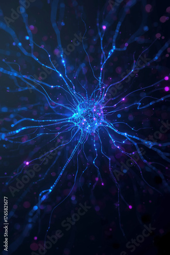 Vibrant blue neural network illustration with glowing synapses and interconnected pathways against a dark cosmic background