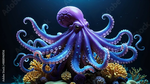 Vibrant blue octopus with curled tentacles in a coral reef.