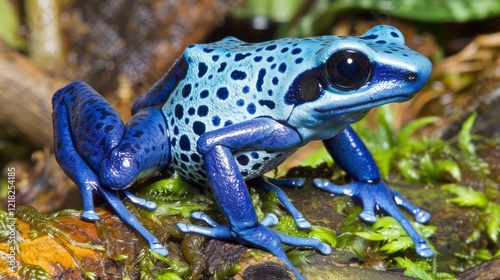 Vibrant blue poison dart frog perched on a mossy log in a lush rainforest habitat