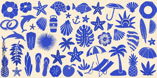 Vibrant blue tropical beach elements and marine life scattered on a light yellow background