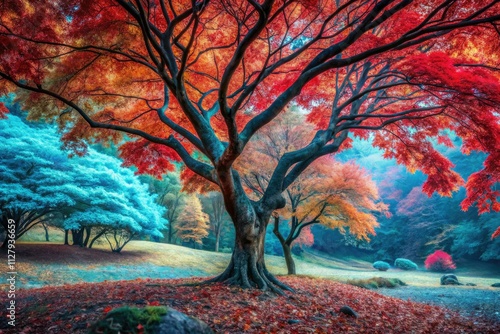 Vibrant blue, turquoise, and red marble swirls create captivating leaf curves, perfectly framed by the rule of thirds.