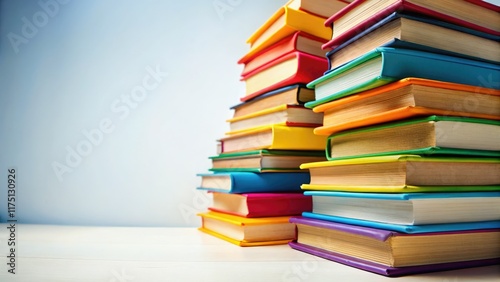Vibrant book stack against a pristine white backdrop; urban exploration vibe.