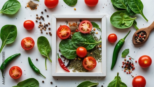Vibrant border of fresh organic spices and herbs on white background with space for your design