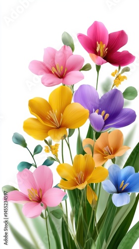 Vibrant botanical illustration of assorted colorful flowers with long stems on a clean white background
