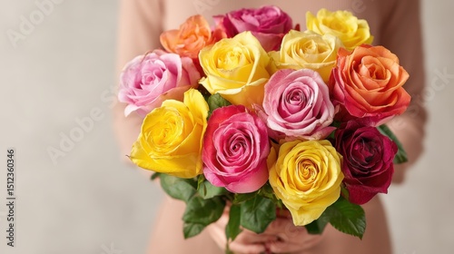 Vibrant bouquet of 14 gradient roses held by woman against minimalistic background