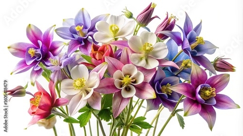 Vibrant Bouquet of Columbine Flowers in Full Bloom on White Background