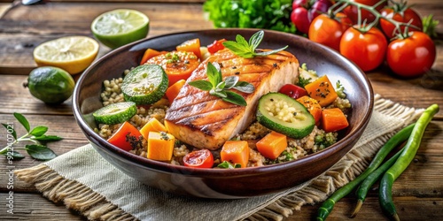 Vibrant bowl filled with roasted vegetables, grilled salmon, and quinoa, garnished with fresh herbs and a citrus wedge, on a rustic wooden background.