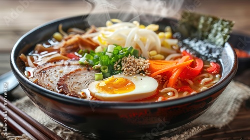 Vibrant Bowl of Ramen Featuring Thick Noodles, Soft-Boiled Egg, Tender Pork Slices, and Colorful Vegetables in Savory Broth with Rising Steam