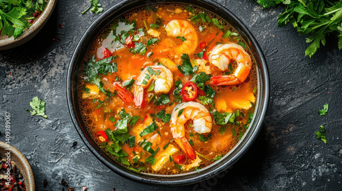 vibrant bowl of shrimp soup garnished with fresh herbs and chili, showcasing delightful blend of flavors and colors