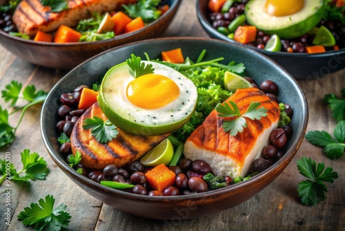 Vibrant bowls filled with roasted sweet potato, black beans, and grilled salmon, garnished with fresh cilantro, lime wedges, creamy avocado, and a crispy fried egg.