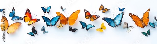 Vibrant Butterflies in a Serene Garden, a captivating scene of colorful butterflies gracefully dancing among lush greenery, set against a soft white backdrop for a tranquil effect
