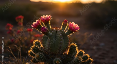 Vibrant Cactus Blooms at Sunset, Showcasing Unique Silhouette and Colorful Flowers in Desert Landscape