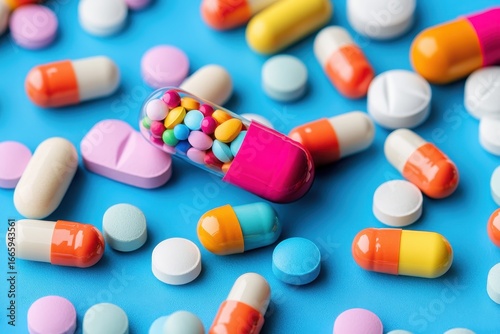 Vibrant capsule pill filled with colorful medicine tablets on blue surface