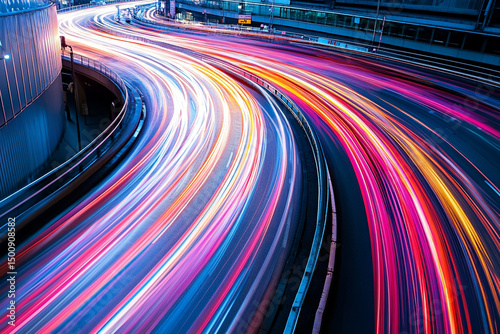 Vibrant car light trails illuminate roundabout during nighttime in urban area