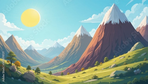 Vibrant Cartoon Mountain Landscape Sunny Day Illustration