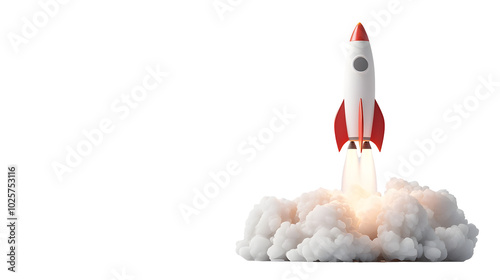 Vibrant cartoon rocket taking off in dynamic motion, surrounded by clouds of smoke, symbolizes adventure and exploration