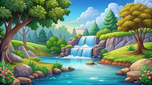 Vibrant Cartoon Waterfall Illustration with Cascading Stream Flowing Over Rocks into a Serene Mountain Lake Surrounded by Lush Vegetation and Bushes in a Lush Park Landscape