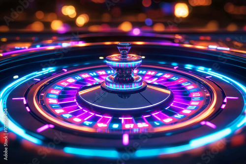 Vibrant casino roulette table with neon lights and central spinning wheel at night