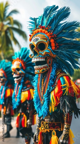 Vibrant ceremonial attire with intricate feather headdresses and traditional masks at a cultural festival highlighting rich indigenous heritage