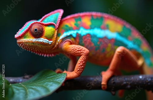 Vibrant chameleon on branch exhibits nature camouflage. Reptile adjusts colors to blend environment. Tropical lizard shows adaptation. Wildlife photography suitable for eco tech projects, education.