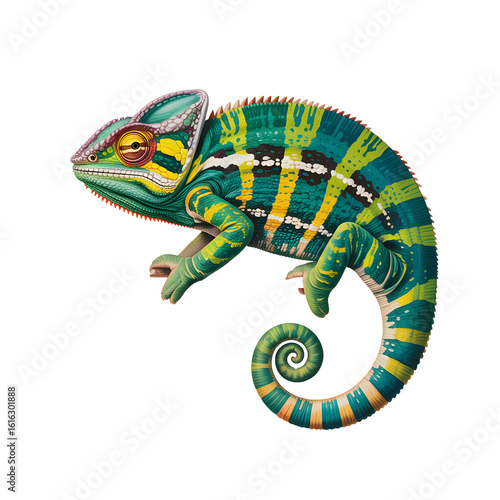 Vibrant chameleon perched amidst leaves showcasing its colorful skin patterns and unique features